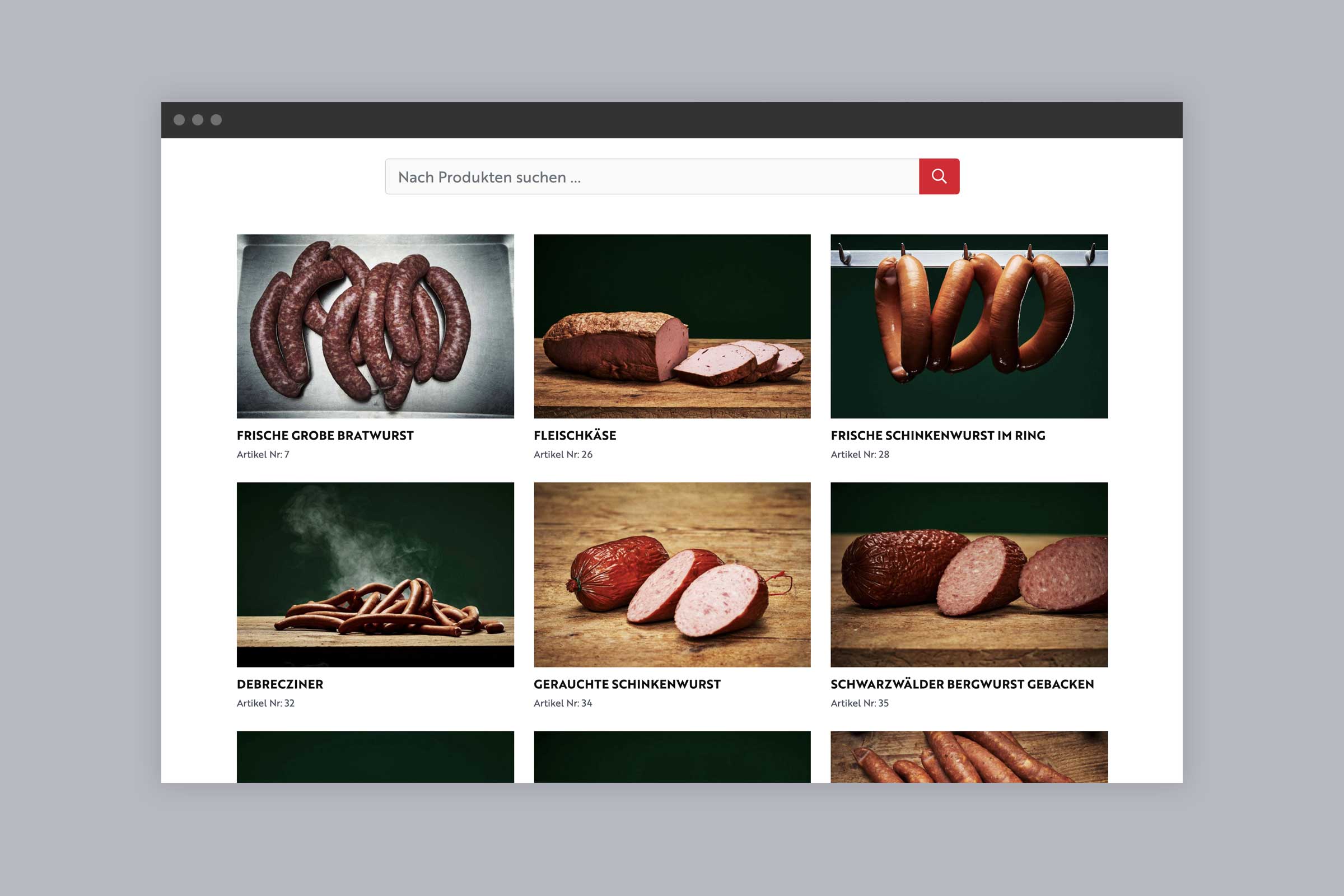 Darstellung der Produkte mit Artikelnummer und Suchfunktion für Bestellungen.