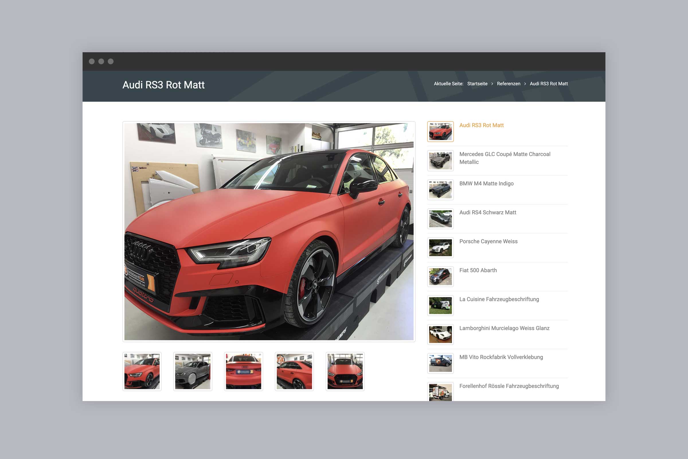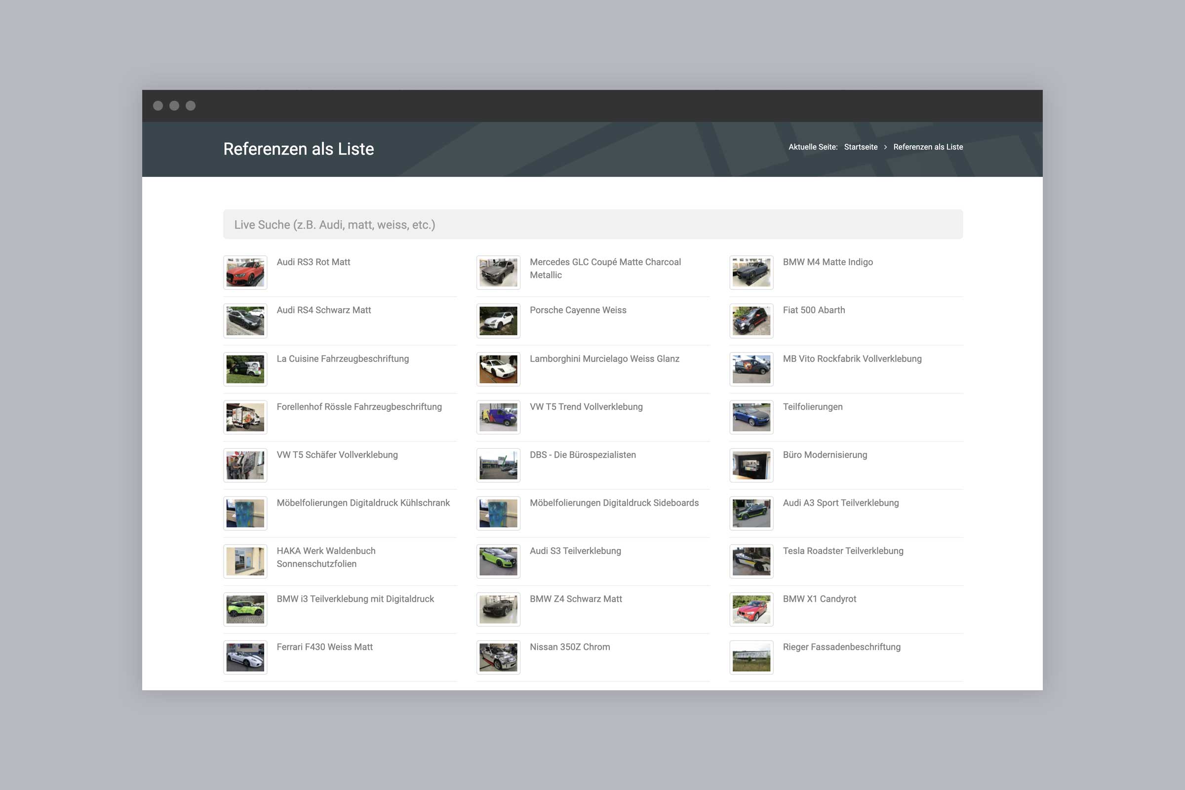 Filterbare Projektübersicht aller folierten Fahrzeuge.