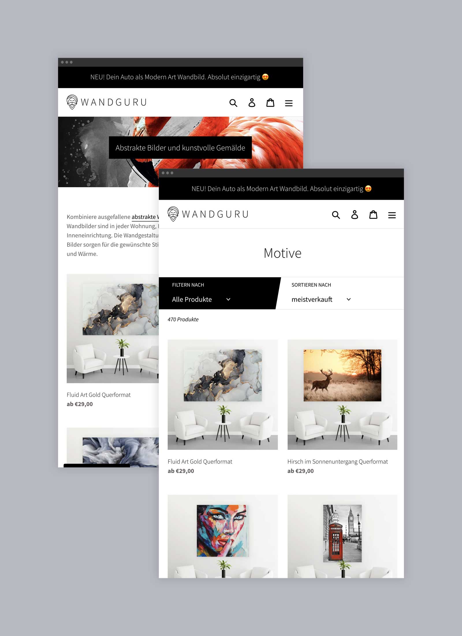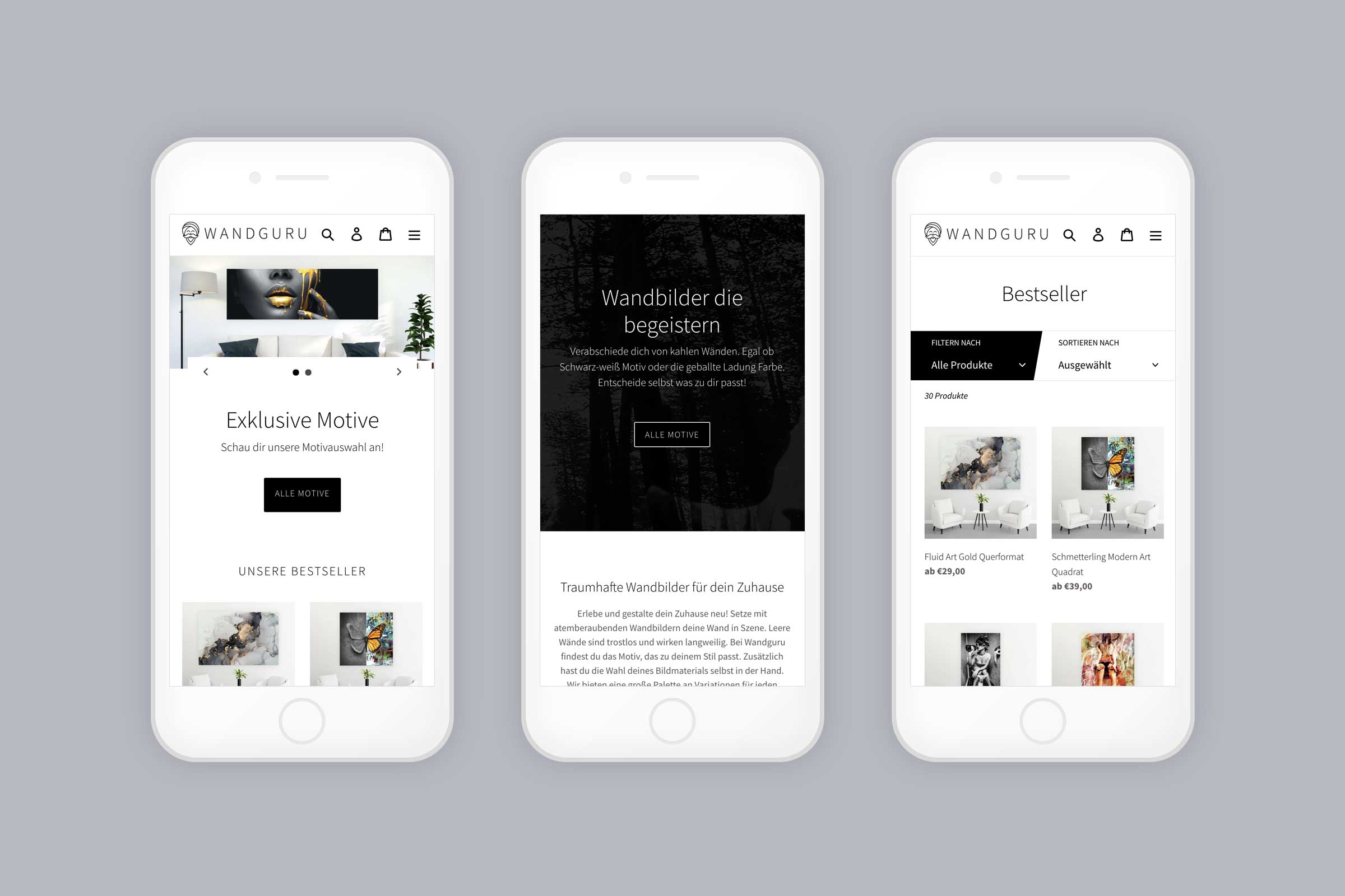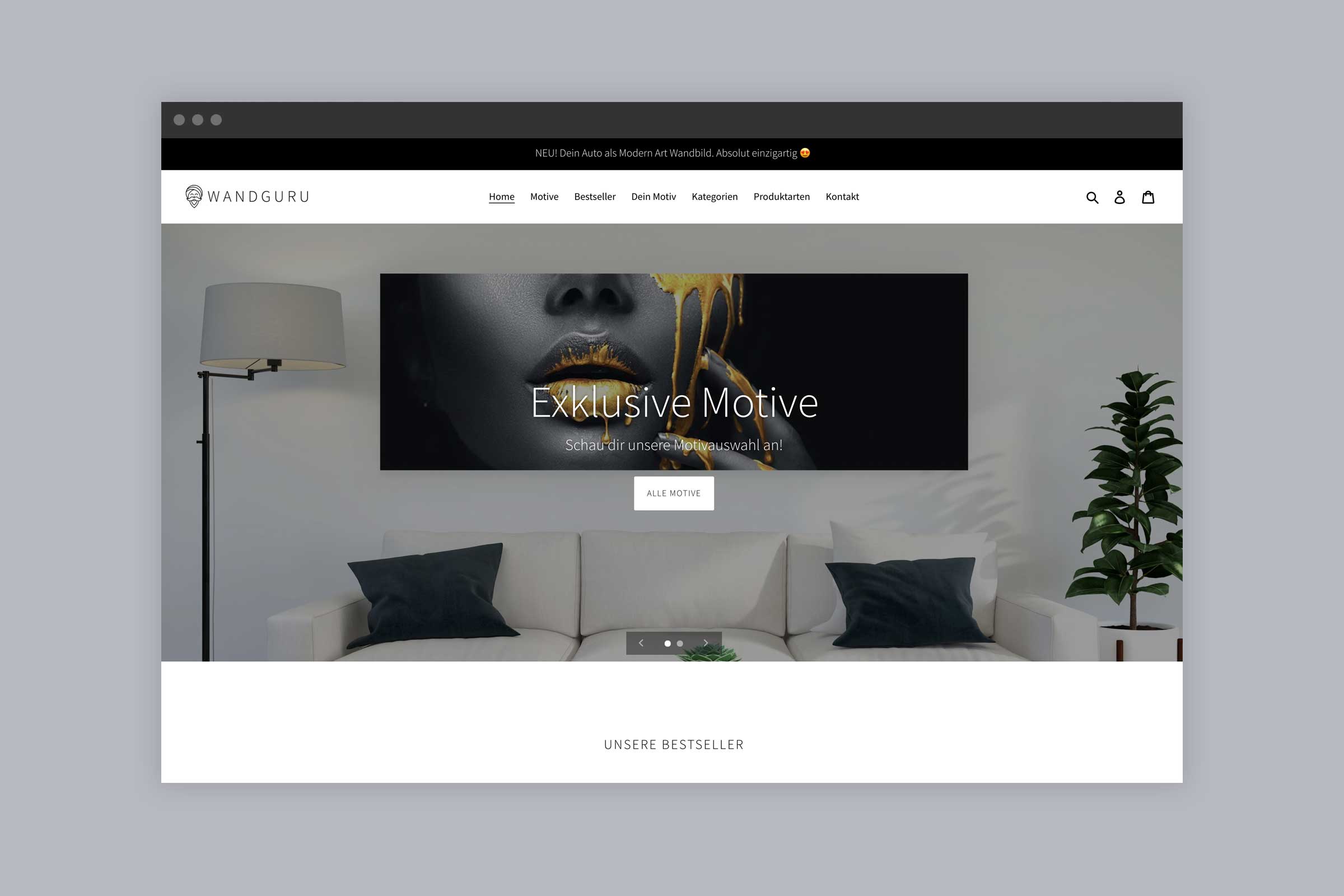 Das junge Startup Wandguru wurde vom ersten Tag an von uns betreut. Von der Logoerstellung bis hin zum Onlineshop stammt alles aus unserer Feder. Kein Wunder, so sind wir ja auch die Köpfe, die hinter dem Projekt Wandguru stehen. Befüttert wird der Shop durch eigene Exportskripte, die Produkte wie von Geisterhand in Shopify importieren. Eine Anbindung an die API einer Bilddatenbank wurde ebenfalls realisiert.