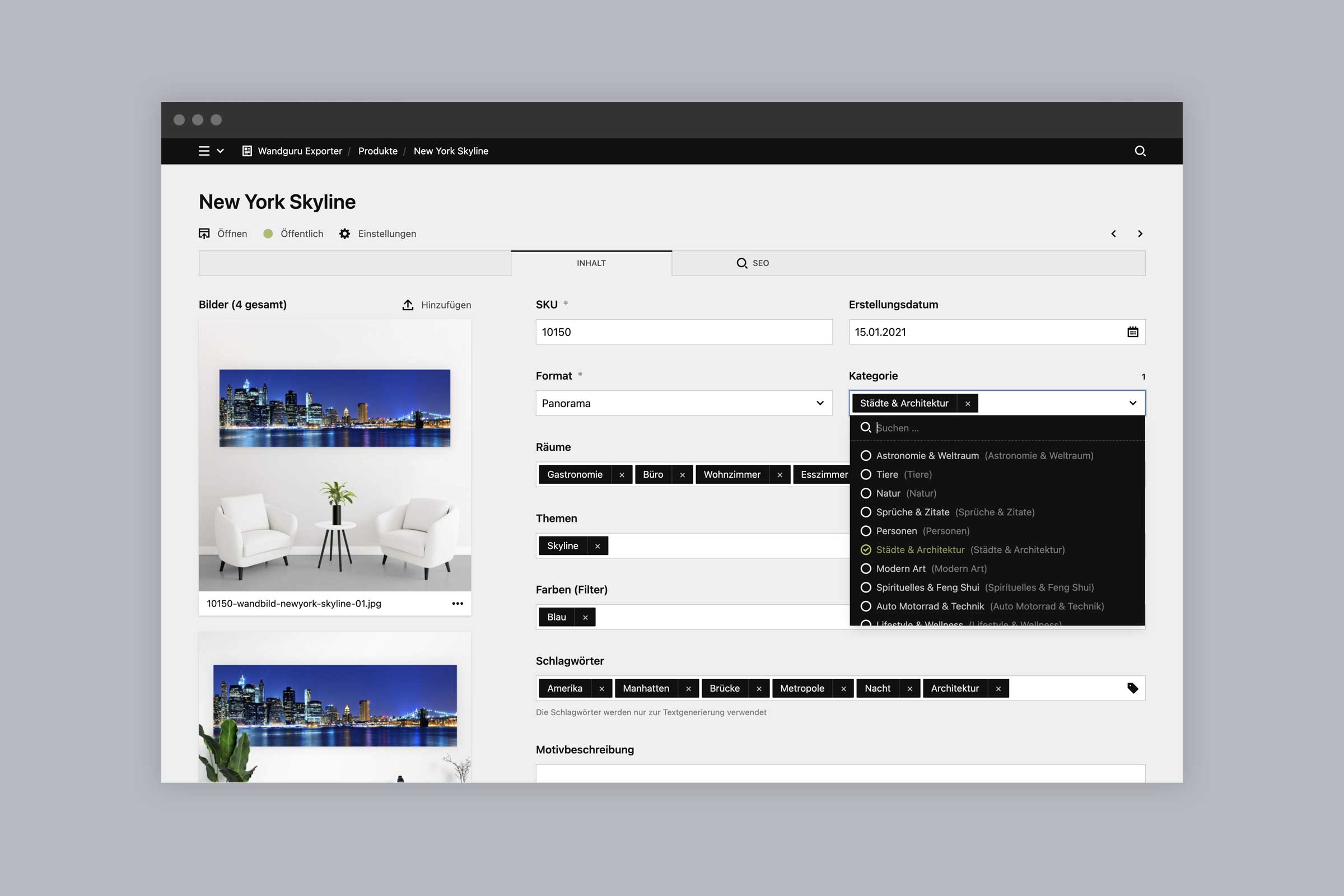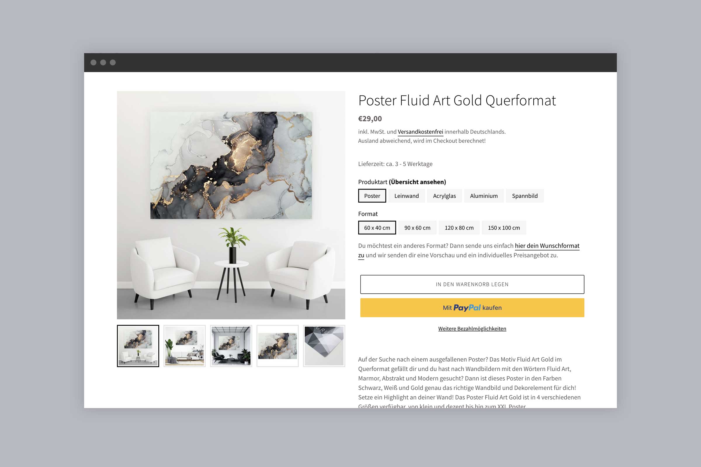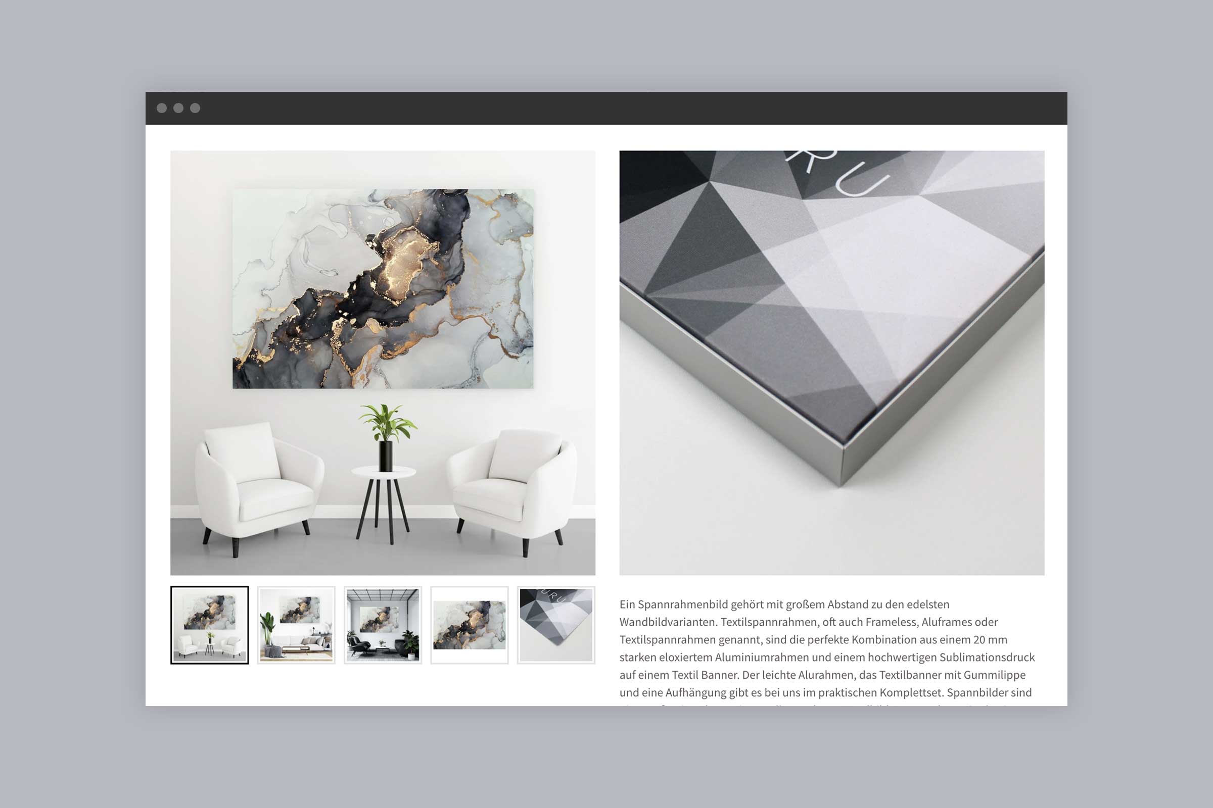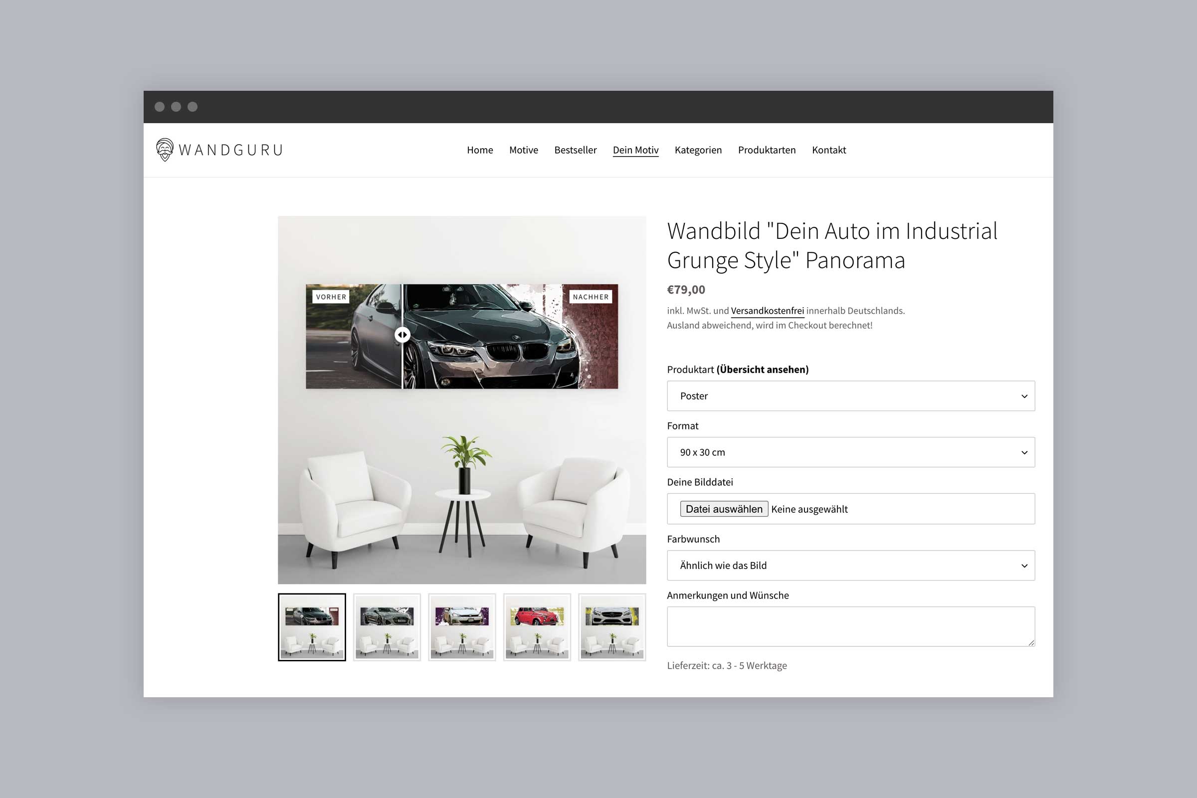 Das junge Startup Wandguru wurde vom ersten Tag an von uns betreut. Von der Logoerstellung bis hin zum Onlineshop stammt alles aus unserer Feder. Kein Wunder, so sind wir ja auch die Köpfe, die hinter dem Projekt Wandguru stehen. Befüttert wird der Shop durch eigene Exportskripte, die Produkte wie von Geisterhand in Shopify importieren. Eine Anbindung an die API einer Bilddatenbank wurde ebenfalls realisiert.